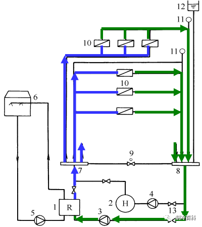 夏季供冷時(shí) :下圖所示,冷水機(jī)組1制出的7℃冷凍水,在冷凍水泵3的作用下送至分水器7,然后由分水器通過(guò)各供水支管分別送至各空調(diào)房間或區(qū)域的空調(diào)設(shè)備10